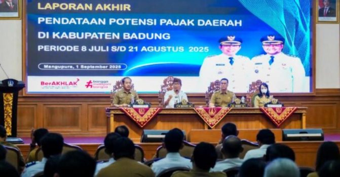 Badung persindonesia.com – Pemerintah Kabupaten Badung berhasil mengidentifikasi lebih dari 19 ribu potensi pajak daerah baru melalui kegiatan pendataan intensif yang berlangsung selama 45 hari. Kegiatan ini menjadi bagian dari upaya optimalisasi pendapatan asli daerah (PAD) dan dipaparkan dalam rapat finalisasi yang digelar di Ruang Kertha Gosana, Puspem Badung, Senin (1/9).