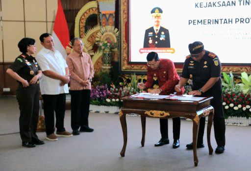 Penandatanganan MoU yang dilaksanakan secara serentak oleh seluruh Kepala Daerah se-Provinsi Bali dengan Kejaksaan Negeri di masing-masing wilayah tersebut disaksikan oleh Sekretaris Jaksa Agung Muda Tindak Pidana Umum, Gubernur Bali I Wayan Koster, serta Kepala Kejaksaan Tinggi (Kajati) Bali, Dr. Chatarina Muliana.