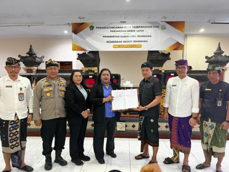 Persindonesia.com Jembrana – Pemerintah Kabupaten Jembrana menjalin kerja sama strategis dengan Kejaksaan Negeri (Kejari) Jembrana dalam bidang hukum perdata dan tata usaha negara yang ditandai dengan penandatangan Nota Kesepahaman antara Bupati Jembrana dengan Kepala Kejaksaan Negeri Jembrana, Kamis (19/6) di ruang rapat aula Jimbarwana Kantor Bupati Jembrana.