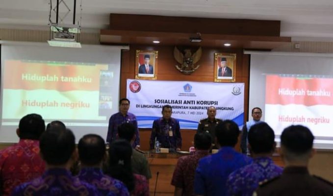 Klungkung,PersIndonesia.Com- Dalam rangka mewujudkan Pemerintahan yang bersih, Pemerintah Kabupaten (Pemkab) Klungkung menggelar sosialisasi anti korupsi kepada para Kepala Perangkat Daerah dan pagawai maupun staf jajarannya, bertempat di ruang Rapat Praja Mandala, Selasa (7/5).