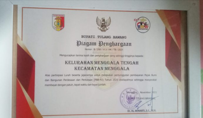 Salah satu Piagam Penghargaan yang diberikan Pemkab tulang bawang diantaranya adalah kelurahan Menggala Tengah Kecamatan Menggala yang mendapatkan reward berupa kulkas, tentunya ini merupakan suatu bentuk apresiasi Pemkab tulang bawang atas kinerja aparatur dalam peningkatan masyarakat untuk membayar PBB P2 tepat waktu.