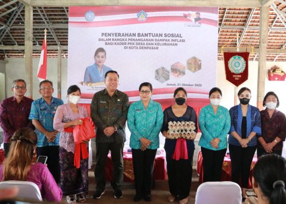 Denpasar – Ketua TP PKK Provinsi Bali Ny. Putri Suastini Koster turun menyerahkan bantuan sosial dalam rangka penanganan dampak inflasi bagi kadek PKK desa dan kelurahan pada empat kecamatan di Kota Denpasar, Jumat (21/10/2022). Penyerahan Bansos diawali di Wantilan Pura Dalem Bungkeneng Desa Adat Tonja Kecamatan Denpasar Utara lanjut ke Banjar Biaung Desa Kesiman Kertalangu Kecamatan Denpasar Timur. Lokasi berikutnya adalah Wantilan Pura Dalem Desa Adat Panjer Kecamatan Denpasar Selatan dan terakhir di Kantor Camat Denpasar Barat.
