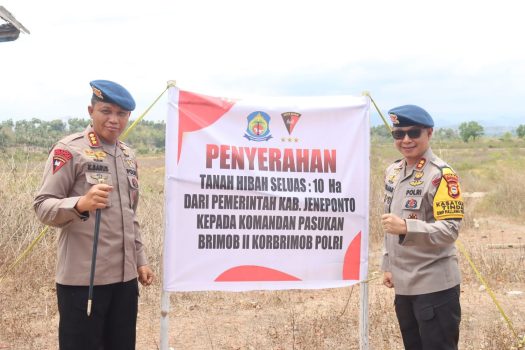 Pemerintah Daerah Kabupaten Jeneponto secara resmi menyerahkan sertifikat tanah kepada Komandan Pasukan Brimob II, Korps Brimob Polri, Brigjen Pol Arif Budiman, S.IK., MH, dalam sebuah acara yang berlangsung di Aula Kalabbirang, Rumah Jabatan Bupati Jeneponto. Penyerahan ini merupakan bagian dari sinergi antara Pemda Jeneponto dan Korps Brimob Polri dalam mendukung upaya peningkatan keamanan serta pembangunan di daerah.