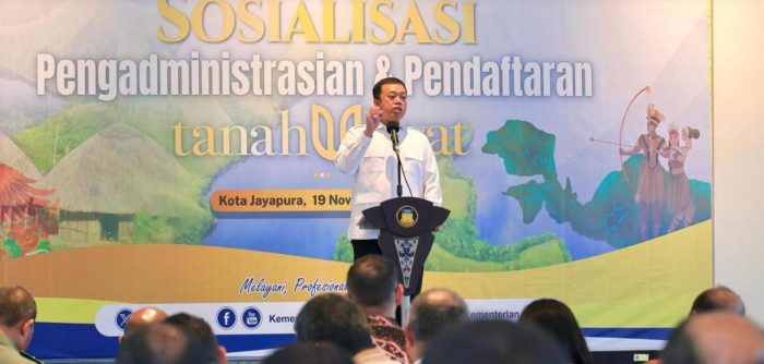 Jayapura persindonesia.comΒ β Menteri Agraria dan Tata Ruang/Kepala Badan Pertanahan Nasional (ATR/BPN), Nusron Wahid, menekankan bahwa percepatan pendaftaran dan sertipikasi tanah ulayat merupakan langkah strategis untuk memastikan masyarakat adat Papua mendapatkan manfaat nyata dari perkembangan ekonomi di daerah mereka. Hal tersebut disampaikan dalam Sosialisasi Pengadministrasian dan Pendaftaran Tanah Ulayat yang digelar di Jayapura, Rabu (19/11/2025).