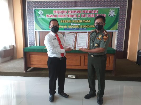BONDOWOSO, Persindonesia – Perhutani KPH Bondowoso bersama Kejaksaan Negeri Bondowoso, Tanda tangani Kerjasama perjanjian penanganan masalah hukum perdata dan tata usaha negara, bertempat di Aula Kejaksaan Negeri Bondowoso, Rabu (23/3/2022).