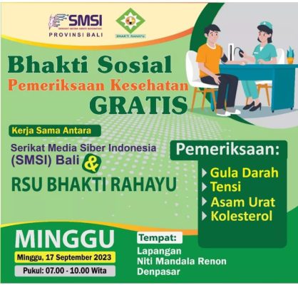 Periksa Kesehatan Geratis, Bhaksos SMSI Bersama RS Bhakti RahayuTim RedaksiSeptember 14, 2023MEDIA PERS INDONESIA Jangan LewatkanPersamakan Langkah Pusat dan Daerah, Bupati Satria dan Forkopimda Hadiri RakornasArahan Presiden Prabowo jadi Motivasi Bali, Gubernur Koster Langsung Bentuk Satgas Penanganan Sampah di Pantai KutaKetua Dekranasda Bali Tekankan Disiplin Diri dan Ketulusan sebagai Kunci Kemajuan UMKMBuka Bulan Bahasa Bali VIII, Gubernur Koster: Aksara Bali harus Tampil di Semua RuangHadiri Rakornas 2026, Bupati Adi Arnawa Tegaskan Komitmen Badung Dukung Program Prioritas PresidenPemkab Badung Siapkan Beasiswa SMA dan S1 untuk Anak Petani dan Nelayan