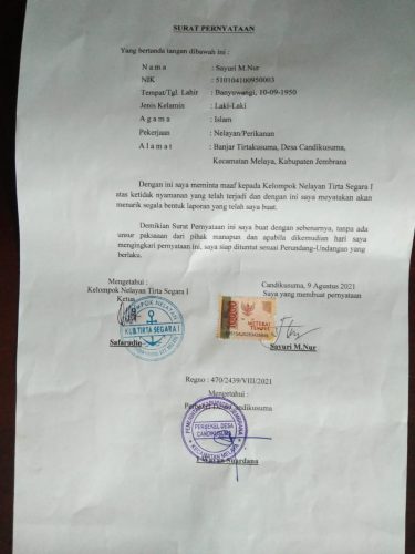 Hal tersebut dibenarkan oleh Sekdes Desa Candikusuma I Putu Suarnaya. “Benar pada tanggal 9 Agustus 2021 memang ada pendatangan perdamaian antara Kelompok Nelayan Tirta Segara 1 dan Bapak Sayuri, dan saya sendiri yang ketik surat pernyataan tersebut, serta permohonan maaf dari Bapak sayuri kepada pihak kelompok,” katanya.