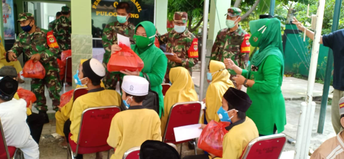 Ketua Persit cabang XIX Kodim 0505/JT Ny. Mauli Rahyanto didampingi Danramil Kapten Inf Irwan Iryanto bersama pengurus dan Persit Ranting 5 Koramil Pulogadung memberikan santunan, Sembako dan Nasi kotak kepada Anak-anak Yatim Piatu tersebut.