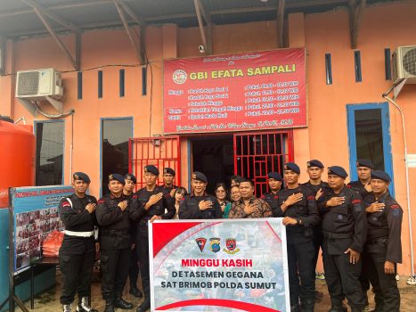 Persindonesia.com Medan, Sat Brimob Polda Sumut || Personil Detasemen Gegana Sat Brimob Polda Sumut melaksanakan kegiatan Minggu Kasih di Gereja GBI Efata Sampali yang dipimpin oleh Wakasubden Wanteror, AKP Mika Nirwana Sihombing, S.Pd. Kegiatan ini bertujuan untuk memupuk tali silaturahmi dan memperkuat kerukunan antarumat beragama. Minggu (06/10/2024).