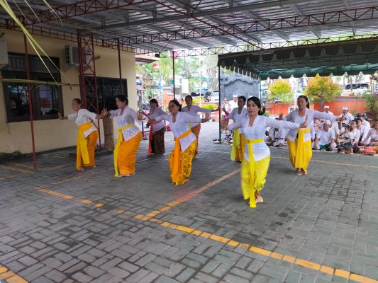 Sebelum acara persembahyangan Piodalan dimulai, Para ibu ibu Bhayangkari melakukan tari Rejang Renteng sebagai rangkain pemujaan dan ucapan syukur Kepada Ida Sang Hyang Widi di depan Pura Merta Jati Benoa.