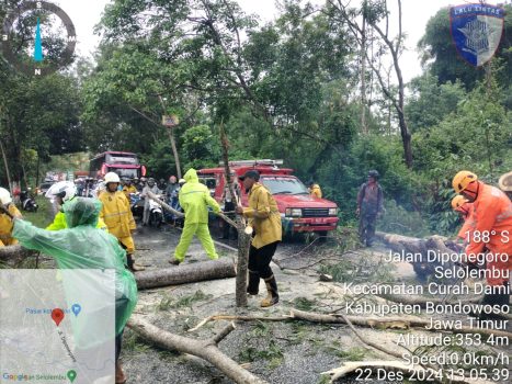 BONDOWOSO, PersIndonesia.com – Curah hujan mengguyur wilayah Kabupaten Bondowoso beberapa waktu terakhir menyebabkan pohon tumbang di jalan propinsi Desa Selolembu Kecamatan Curah hingga menutupi ruas jalan yang menyebabkan kemacetan arus Lalu Lintas.