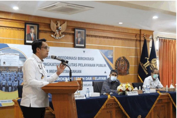 Denpasar Persindo (23/02/2022), Kantor Imigrasi Denpasar melaksanakan kegiatan Penguatan Sumber Daya Manusia (SDM) dengan mengundang Umar Ibnu Alkhatab selaku Kepala Ombudsman RI Perwakilan Bali. Acara dengan tema “Penguatan Reformasi Birokrasi Peningkatan Kualitas Pelayanan Publik dalam mempertahankan Wilayah Birokrasi Bersih dan Melayani (WBBM)” tersebut juga dihadiri oleh Kepala Divisi Keimigrasian Kantor Wilayah Kementerian Hukum dan HAM Bali serta diikuti oleh seluruh pegawai Kantor Imigrasi Denpasar baik yang hadir langsung di aula kantor maupun secara daring dari ruang kerja masing-masing. Acara yang dimulai pukul 09.30 WITA tersebut dimulai dengan melakukan peninjauan lingkungan Kantor Imigrasi Denpasar oleh Kepala Ombudsman RI Perwakilan Bali didampingi Kepala Kantor Imigrasi Denpasar beserta jajaran dengan tetap memperhatikan protokol kesehatan.