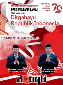 Bangli,PersIndonesia.Com- Atas nama Pimpinan dan Anggota dan seluruh jajaran Dewan Perwakilan Rakyat Daerah (DPRD) Kabupaten Bangli mengucapkan selamat HUT Kemerdekaan Republik Indonesia (RI) yang ke-79 tahun 2024.