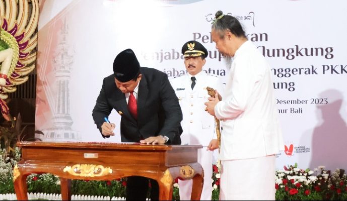 DENPASAR – Penjabat (Pj) Gubernur Bali S.M. Mahendra Jaya melantik dan mengambil sumpah jabatan I Nyoman Jendrika sebagai Pj. Bupati Klungkung dalam prosesi pelantikan yang berlangsung di Ruang Wiswa Sabha Utama Kantor Gubernur Bali, Sabtu (16/12/2023).