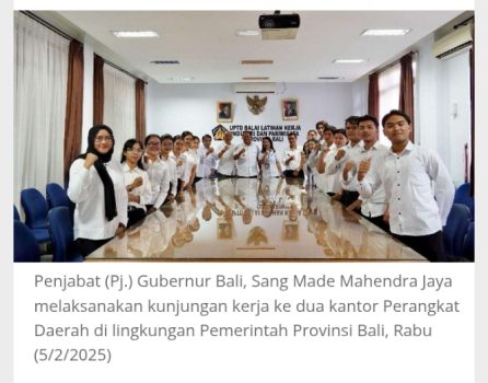 Denpasar, persindonesia.com | Penjabat (Pj.) Gubernur Bali, Sang Made Mahendra Jaya, melakukan kunjungan kerja ke dua instansi penting di lingkungan Pemerintah Provinsi Bali pada Rabu (5/2/2025). Kunjungan tersebut mencakup Dinas Ketenagakerjaan dan Energi Sumber Daya Mineral (Disnaker ESDM) serta Dinas Perindustrian dan Perdagangan (Disperindag).