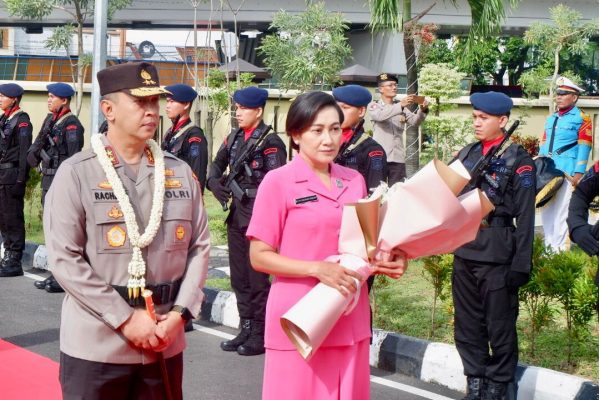 Terpantau dilapangan Kapolda Sumsel Irjen Pol. Albertus Rachmad Wibowo, S.I.K. bersama istri saat memasuki halaman Mapolda Sumsel disambut dengan pengalungan bunga hingga tari tanggai selamat datang di Bumi Sriwijaya.