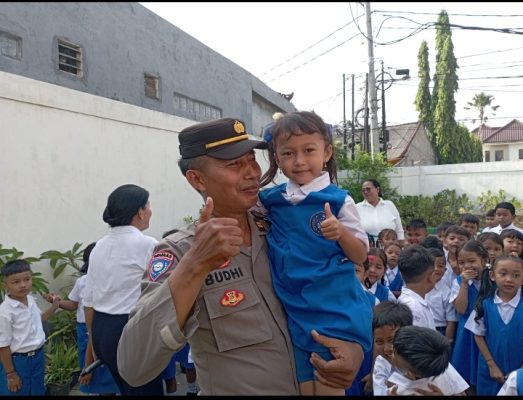Denpasar – Kanit Binmas Iptu Wayan Budiartana, S. H., bersama Panit Binmas Ipda Wayan Budiartana mewakili Polsek Denpasar Barat menyambangi Taman Kanak Kanak (TK) Negeri Hindu Kumara Widyalaya Desa Padangsambian Kelod dalam kegiatan Polisi Sahabat Anak, Rabu (8/11/2023) pagi.