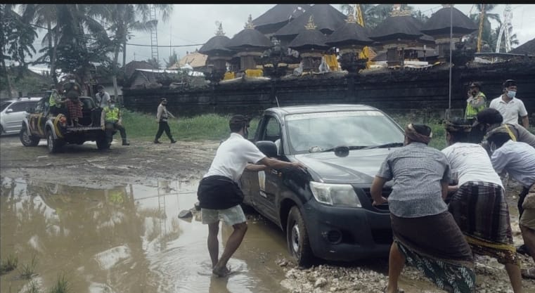 BLAHBATUH- Intensitas curah hujan yang cukup tinggi di wilayah Kecamatan Blahbatuh Gianyar akhir-akhir ini menyebabkan beberapa ruas jalan dan tempat menjadi berlumpur serta tergenang air. Hal ini sering mengakibatkan mobil terjebak dalam genangan dan memerlukan bantuan derek untuk mengeluarkannya.