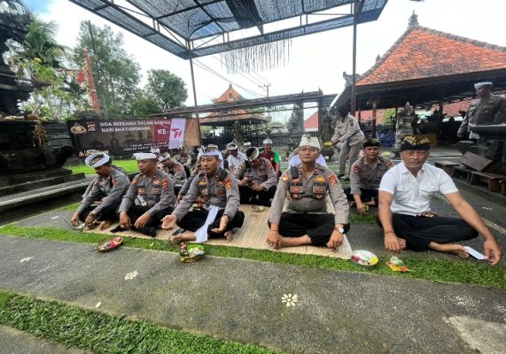 Acara yang digelar di Pura Giri Brata Polres Bangli menghadirkan pejabat Utama Polres Bangli, para Kapolsek dan personil umat Hindu dengan Doa Puja Mantra Mangku Aiptu Wayan Budiarga