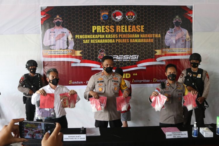 “Pada hari ini, kami melaksanakan kegiatan Press Conference pengungkapan kasus peredaran narkotika di Kota Banjarbaru, total ada sebanyak 487,41 gram barang bukti narkotika jenis sabu-sabu senilai kurang lebih Rp 791 juta berhasil diamankan oleh Sat Res Narkoba Polres Banjarbaru,” jelas Kapolres Banjarbaru AKBP Nur Khamid, S.H., S.I.K., M.M.