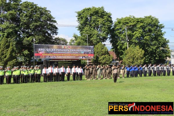 BONDOWOSO, Persindonesia.com – Kapolres Bondowoso AKBP Bimo Ariyanto, SH. S.I.K melalui Wakapolres Bondowoso Kompol. Joes Indra Lana Wira, SH pimpin Apel gelar pasukan dan peralatan kesiapsiagaan bencana hidrometeorologi tahun 2023-2024 di wilayah Kabupaten Bondowoso. 30/11 2023.