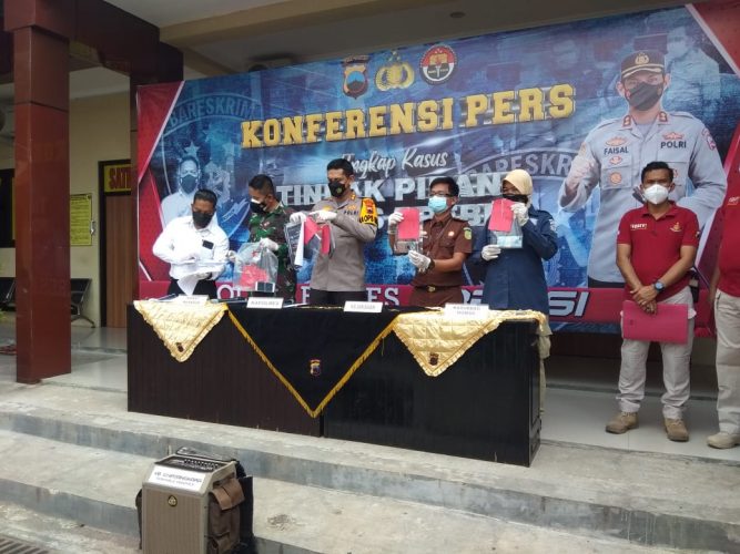 Kapolres Brebes, AKBP Faisal Febrianto saat menggelar Konferensi Pers, Rabu (21/7/2021). mengatakan “Tersangka dengan inisial MK terancam kurungan 12 tahun penjara. Di mana, tersangka dikenakan Pasal 51 Ayat 1 Jo Pasal 35 Undang-undang ITE Tahun 2016,” tegasnya