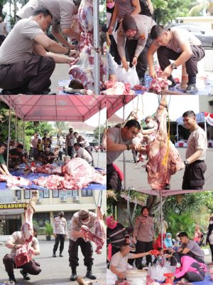 Pemotongan hewan qurban tersebut digelar di halaman Mapolsek Pulogadung, Jln. Polsek Pulogadung Jaktim.