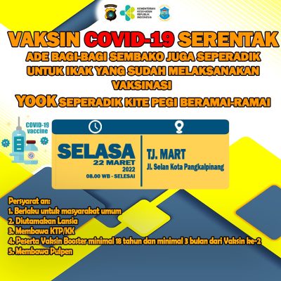 “Kepada masyarakat Kota Pangkalpinang, kegiatan vaksinasi dosis 1, 2 dan 3 yang akan dilaksanakan besok selasa 22 Maret 2002 dimulai dari pukul 08.00 Wib sampai selesai di TJ Mart Jalan Selan, ungkap Kapolres Pangkalpinang. Senin 21/3/2022.