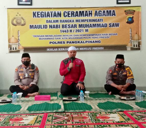 Pangkalpinang – Kepolisian Resor (Polres) Pangkalpinang menggelar peringatan Maulid Nabi Muhammad SAW 1443 H / 2021 M, yang berlangsung di Aula Sarja Arya Racana Polres Pangkalpinang, Kamis 19/10/2021.