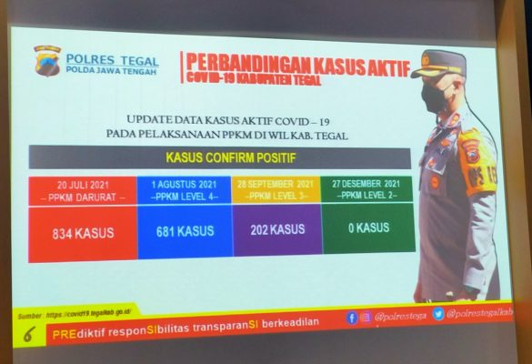 Kapolres Tegal AKBP Arie Prasetya Syafa’at dalam siaran persnya pada 31 Desember 2021, pagi di Ruang pertemuan Polres Tegal mengemukaan, bahwa kondisi covid -19 di Kabupaten Tegal yang ditanganinya terus menurun hingga titik Zero