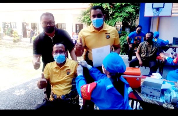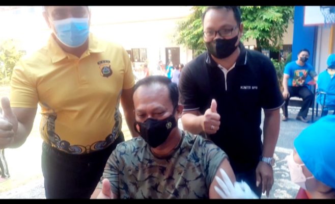 Kapolsek Denpasar Timur (Dentim)Â Kompol Tri Joko Widiyanto,A.Md.,S.H., seusai menerima vaksinasi didampingi Waka Polsek AKP Ketut Suantara,