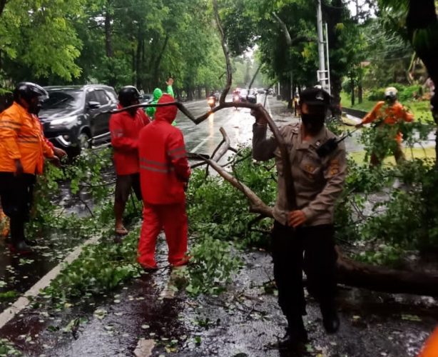 Terjadi pohon tumbang (pohon Santan berdiameter 30cm) sekira pukul 07 Wita, di Jalan Drupadi XIII Dentim, pohon tumbang menimpa kabel PLN dan menghalangi jalan.