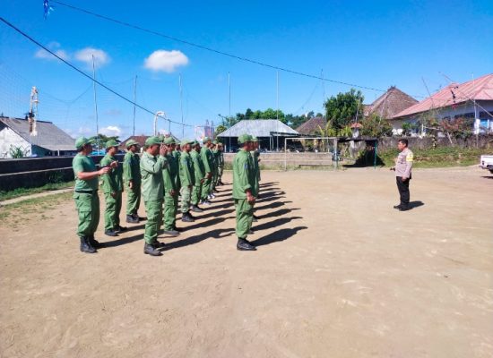 Bhabinkamtibmas Desa Bayung Cerik Kintamani yang memberikan materi Peraturan Baris Berbaris (PBB) kepada Anggota Linmas Desa Bayung Cerik dengan tujuan melatih kedisiplinan dan kerja sama antar anggota Linmas melalui pelatihan PBB.