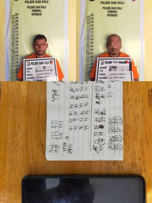 Pelaku adalah JP (50) dan SS (50) warga Desa Tanah Merah, Kecamatan Siak Hulu, kedua pelaku di tangkap di Jalan Karya IV Gg Tapanuli Desa Tanah Merah, Kecamatan Siak Hulu di warung tuak milik JP. Dari keduanya berhasil diamankan barang bukti handphone merk Oppo warna hitam dan rekap rumus togel.