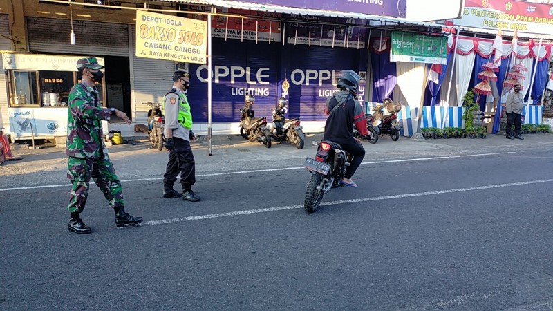 Ubud Bali – Bertempat di depan pos Penyekatan Simpang empat Jln. Raya Kengetan, Desa Singakerta, Kecamatan Ubud, Kabupaten Gianyar Panit 2 Lantas Polsek Ubud, Aiptu Ida Bagus Nyoman Raka pimpin Giat Penyekatan dan Ops Yustisi pendisiplinan protokol kesehatan dalam rangka penerapan Pemberlakuan Pembatasan Kegiatan Masyarakat ( PPKM ) Level IV yang diperpanjang sampai tanggal 02 Agustus 2021. (01/08)