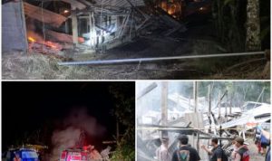 Berselang kurang lebih 10 menit kemudian saksi mendengar suara ledakan yang berasal dari arah pos pintu masuk yang ditinggalkannya. Mengetahui hal tersebut saksi segera melakukan pengecekan dan mendapati bangunan pos pintu masuk telah terbakar.