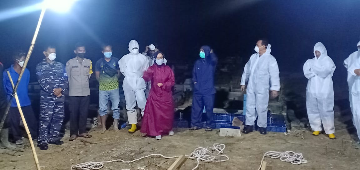 JEBUS — Posmat Jebus jajaran Lanal Babel pimpin pelaksanaan prosesi pemakaman jenazah yang pertama kepada salah satu warga Desa Sinar Manik yang terindikasi covid 19 pada tengah malam,Minggu 18/03/2021 bertempat di TPU Sinar Manik Kecamatan Jebus Kabupaten Bangka Barat.