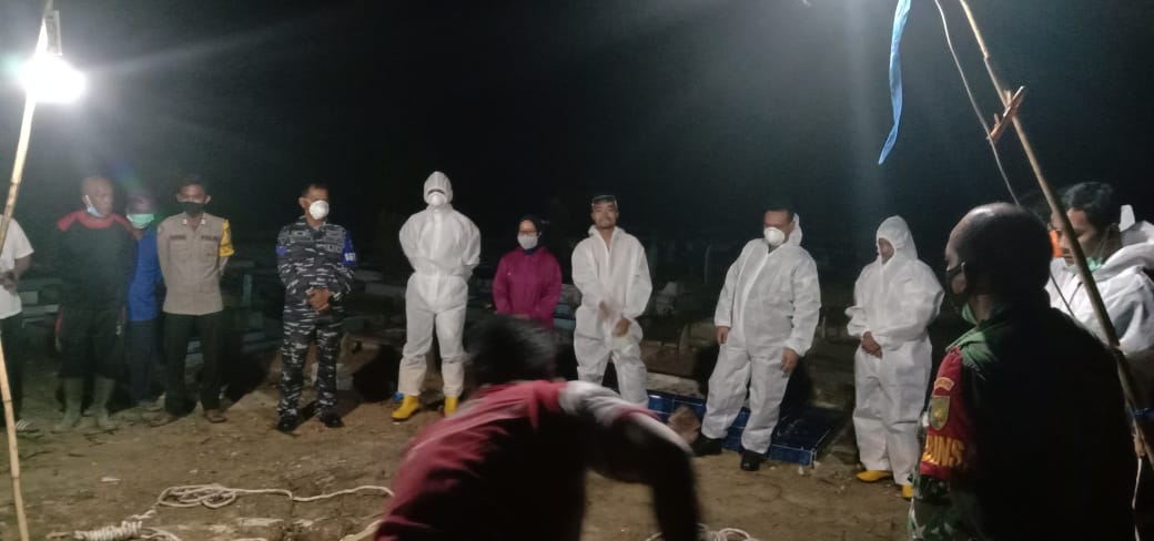 JEBUS — Posmat Jebus jajaran Lanal Babel pimpin pelaksanaan prosesi pemakaman jenazah yang pertama kepada salah satu warga Desa Sinar Manik yang terindikasi covid 19 pada tengah malam,Minggu 18/03/2021 bertempat di TPU Sinar Manik Kecamatan Jebus Kabupaten Bangka Barat.