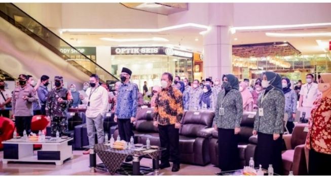 Bupati Jember, Ir. H. Hendy Siswanto didampingi Wabup KH. MB. Firjaun Barlaman meresmikan Gerai Vaksinasi Covid-19 yang ditempatkan di Lippo Plaza Jember, Kamis (17/06/2021).