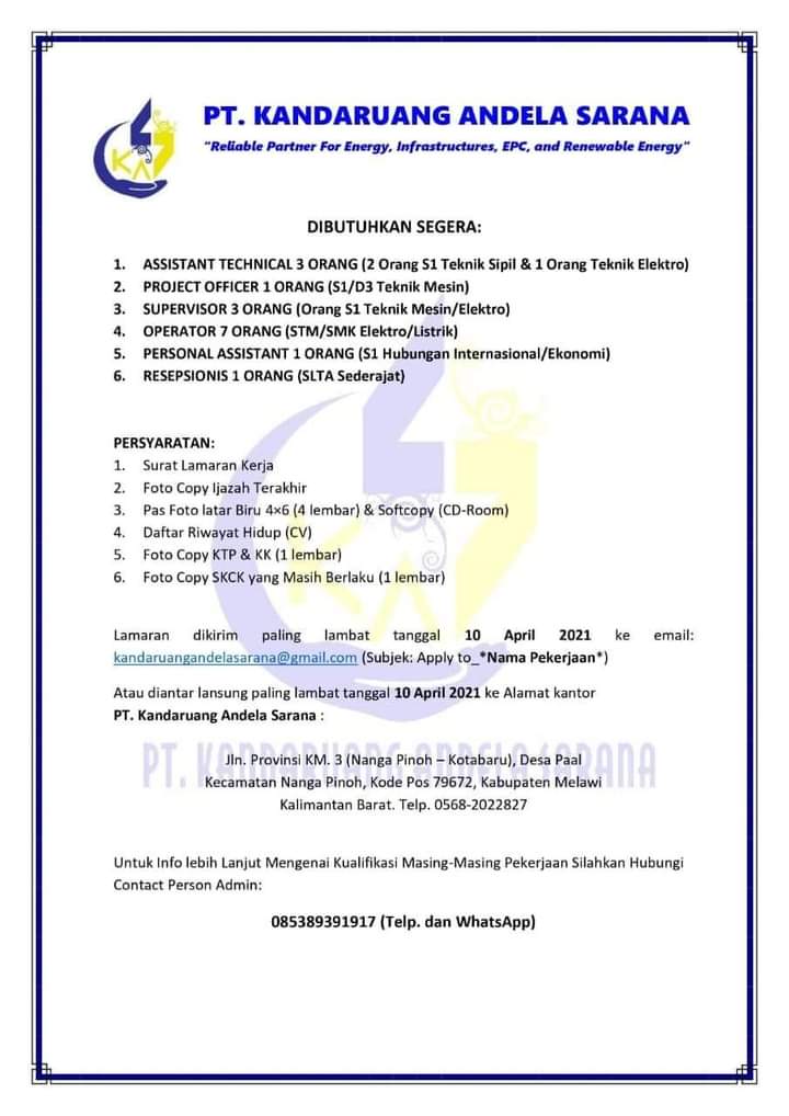 Bagi calon pelamar yang tertarik ingin bergabung, lamaran kerja ini hanya dapat dikirim melalui email:kandaruangandelasarana@gmail.com atau mengantar secara langsung kealamat kantor PT. kandaruang Andela Sarana (a.m)