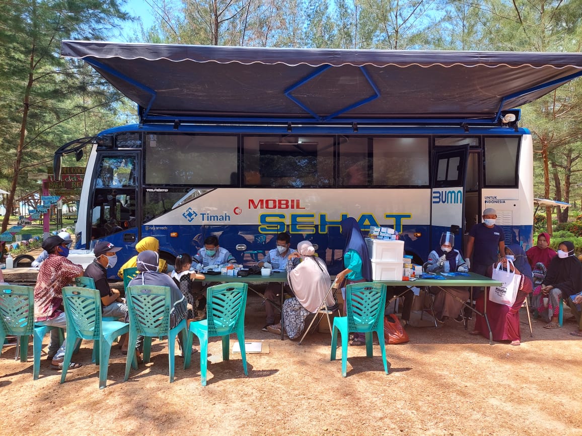 BATU BELUBANG — Disambut antusias oleh masyarakat Desa Batu Belubang Kecamatan Pangkalanbaru Kabupaten Bangka Tengah (Bateng) saat PT Timah Tbk mengelar pengecekan kesehatan dan pengobatan gratis menggunakan mobil sehat , Senin (26/4/2021) Pagi.