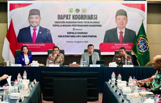 Ternate, Maluku Utara Media Persindonesia (persindonesia.com)โ Dalam upaya mempercepat pelaksanaan sertipikasi tanah di Indonesia, Menteri Agraria dan Tata Ruang/Kepala Badan Pertanahan Nasional (ATR/BPN), Nusron Wahid, menekankan pentingnya peran aktif Pemerintah Daerah, terutama pemerintah desa, dalam mendukung proses legalisasi tanah. Hal ini disampaikan dalam Rapat Koordinasi yang digelar bersama jajaran Pemda Provinsi Maluku Utara di Kota Ternate, Sabtu (23/08/2025).