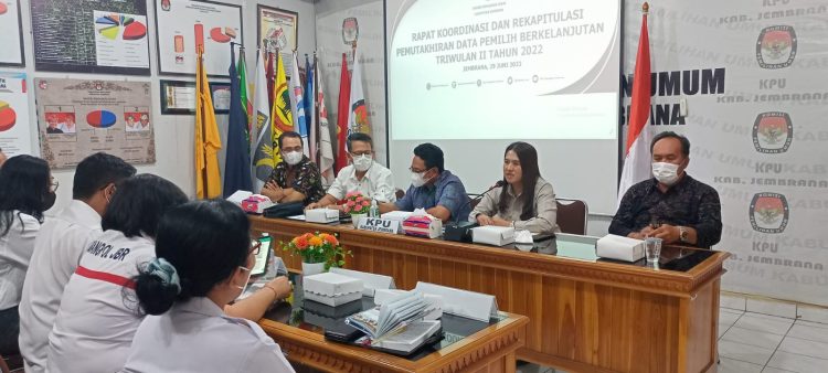 Rakor tersebut bertujuan menindaklanjuti Peraturan Komisi Pemilihan Umum Republik Indonesia Nomor 6 Tahun 2021, Tanggal 11 Desember Tahun 2021 bertempat di Ruang Rapat Kantor KPU Jembrana serta untuk persiapan menjelang Pemilu 2024. Dari Data Pemilih Berkelnajutan (DPB) di triwulan ke 2 sampai bulan Juni 2022 sebanyak 237.525 pemilih. Sampai bulan Juni ini lebah banyak pemil yang baru, sebanyak 70 pemilih. Sedangkan jumlah pemilih tidak memenuhi syarat (TMS) sebanyak 49 pemilih.