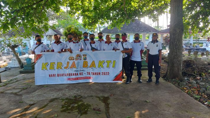 Kini, masih masuk dalam rangkaian HUT Bhayangkara ke 76. Personil Polres Bondowoso melaksanakan kerja bakti bersih-bersih Taman Makam Pahlawan (TMP).