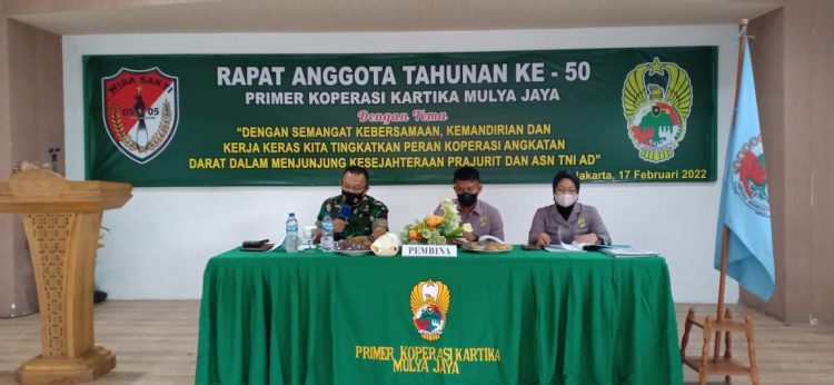 Kodam Jaya – Jakarta Timur. Primer Koperasi Kartika Mulya Jaya Kodim 0505/JT melaksanakan Rapat Anggota Tahunan (RAT) Ke-50 Tahun 2022, dengan tetap memperhatikan protokol kesehatan kegiatan RAT diselenggarakan di Aula Makodim yang diikuti seluruh prajurit dan PNS Kodim 0505/Jakarta Timur, Kamis (17/02/2022).
