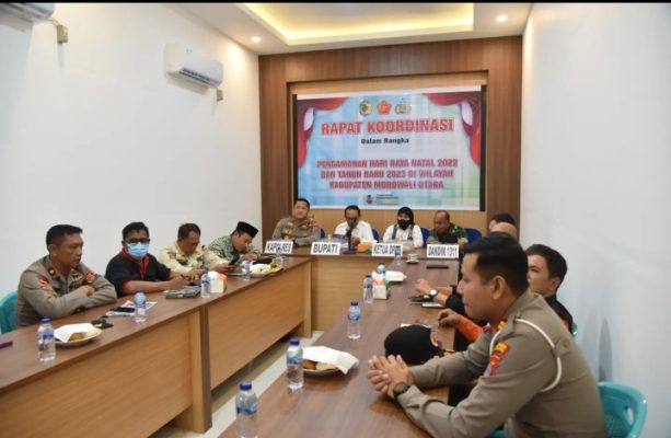 KOROWOU- Polres Morowali Utara bersama Pemerintah Kabupaten Morowali Utara menggelar rapat koordinasi dalam hal mempersiapkan pengamanan dan penertiban menuju Natal 25 Desember 2022 dan malam Tahun Baru 2023 di Mapolres Morowali Utara Jumat (16/12/2022).