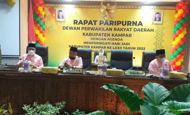 Bangkinang kota – Dewan Perwakilan Rakyat Daerah (DPRD) Kabupaten Kampar, melaksanakan Sidang Paripurna dengan agenda Hari jadi kabupaten kampar yang ke 72. pada hari ini, Minggu tanggal 06 Februari 2022, rapat dilaksanakan di ruangan paripurna gedung DPRD Kabupaten Kampar lantai 2 Bangkinang Kota.