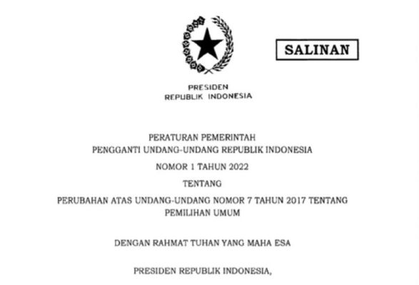 Jakarta, Persindonesia.com,– Pemerintah resmi menerbitkan Peraturan Pemerintah Pengganti Undang-Undang (Perppu) Nomor 1 Tahun 2022 tentang Perubahan Atas UU Nomor 7 Tahun 2017 tentang Pemilihan Umum. Presiden Joko Widodo menandatangani Perppu Nomor 1 Tahun 2022 tersebut pada 12 Desember 2022.