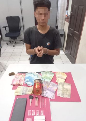 Dari pelaku ditemukan barang bukti 2 paket narkotika jenis shabu terbungkus plastik bening, sebuah HP merk Oppo warna hitam, 1 unit sepeda motor Honda Beat Nopol BM-5413-OI, beberapa peralatan penggunaan shabu dan uang tunai sebesar Rp 1,3 juta yang diduga dari hasil transaksi narkoba.