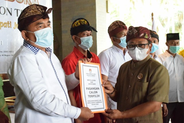 Terkait Keputusan Penetapan Pasangan Cabup dan Cawabup Jembrana dibacakan oleh Kasubag Hukum KPU I Nyoman Giri Gunadi, SH dan diiringi dengan penyerahan salinan Keputusan penetapan calon terpilih oleh Ketua KPU Jembrana, ini juga sebagai penutup Rapat Pleno Terbuka Penetapan Calon Bupati dan Wakil Bupati Jembrana Terpilih dalam Pemilihan Bupati dan Wakil Bupati Jembrana tahun 2020. (Ida)